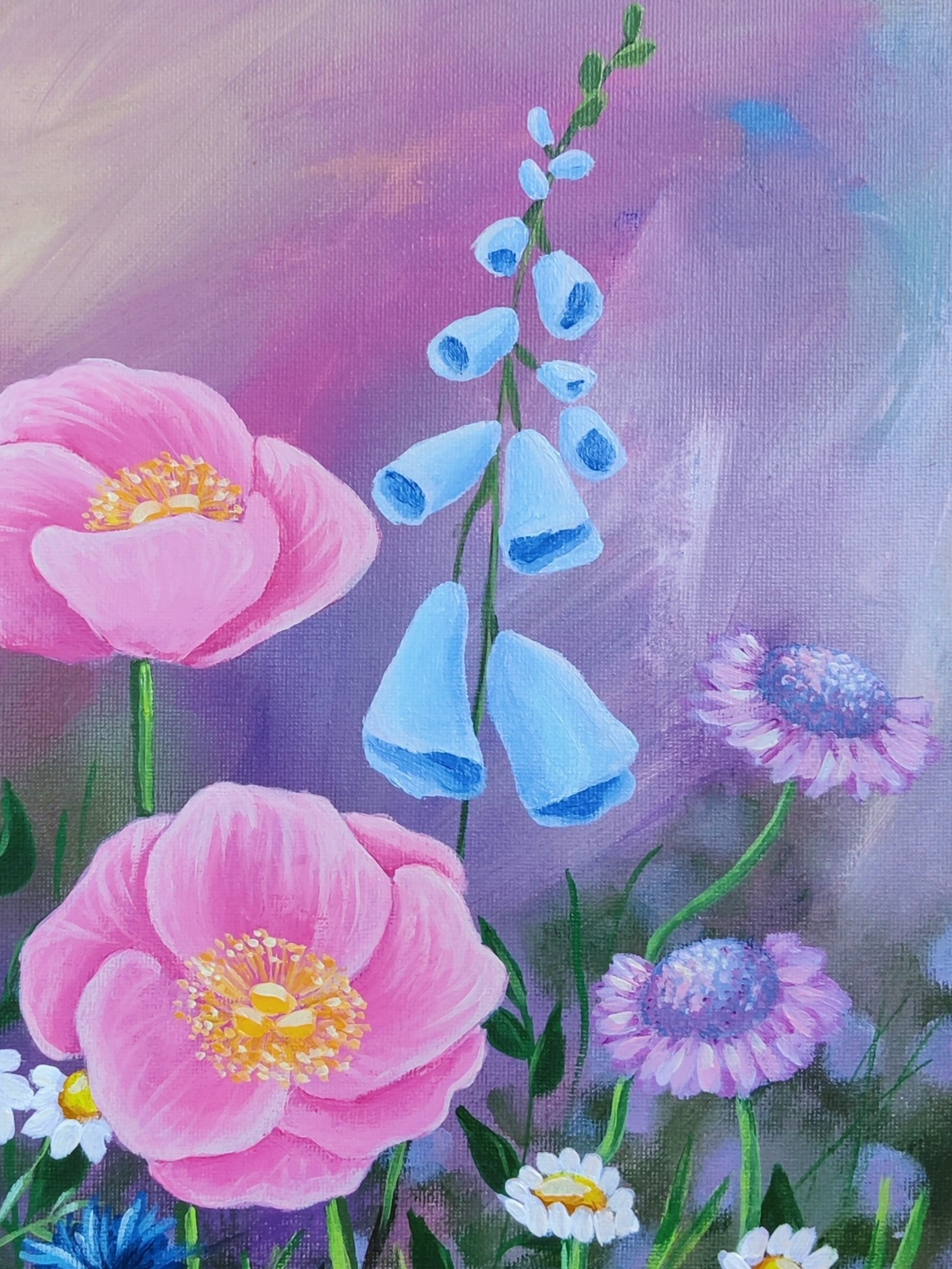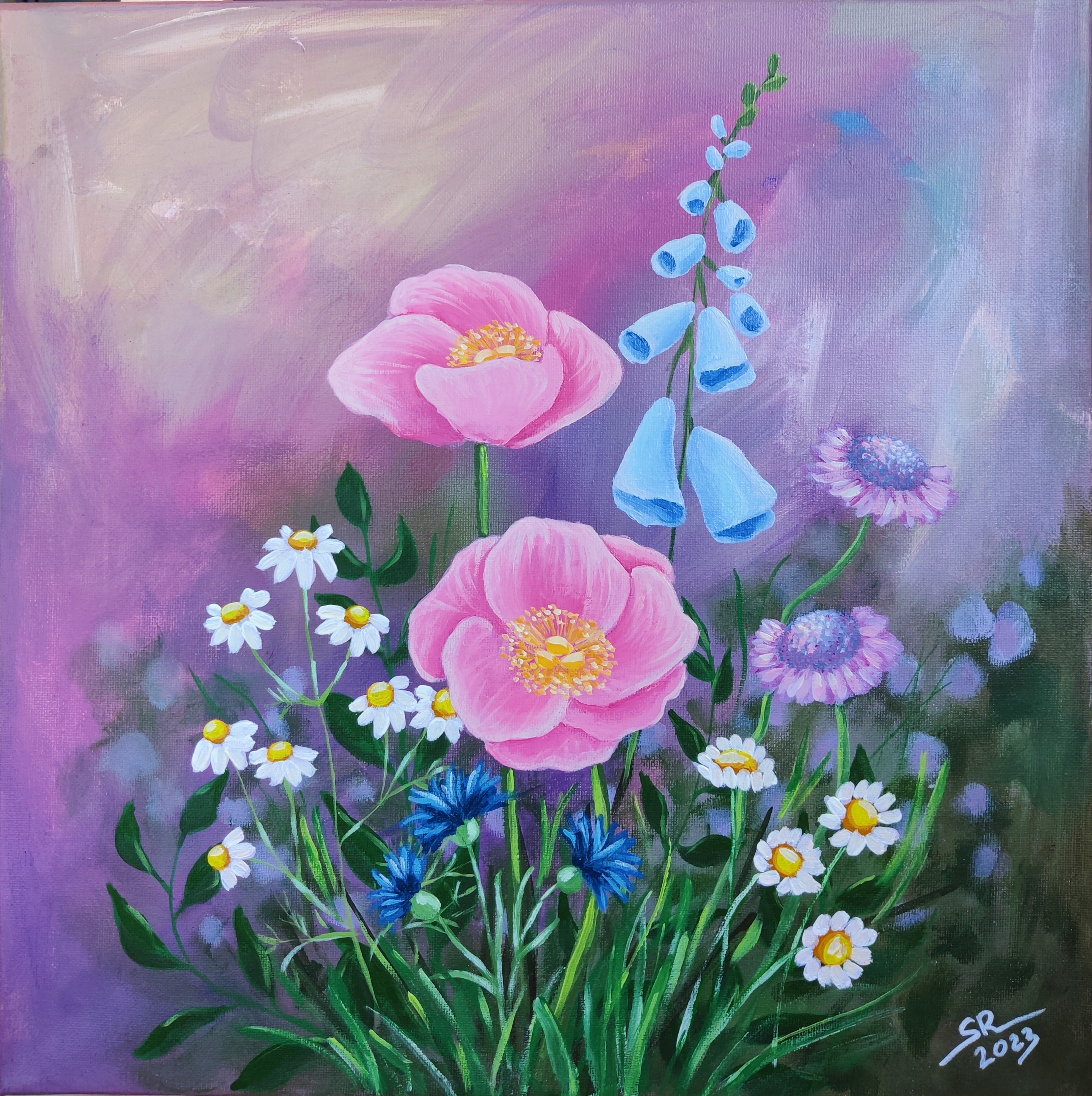 ”Blooming in the Evening Glow” on syntynyt kesäillan hetkestä, jossa aurinko on juuri laskenut horisontin taakse ja puutarha kylpee alkuillan väreissä. Siinä hetkessä on aivan erityinen tunnelmansa. Siinä on rauhaa, virkistävää viileyttä kuuman päivän jälkeen.